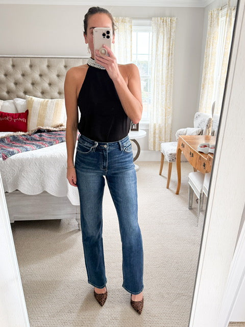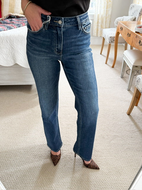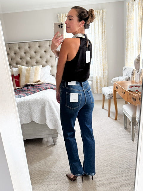 High rise perfection ....with this stretchy dark clean denim straight leg!